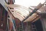 Zunächst wurde ein Stahlträger in der Flucht der Regenrinne auf eine rückwärtige Mauer und eine Stahlstütze aufgelagert. An diesen Träger wurden die gewölbten Sparren auf den Untergurt aufgelagert und mit Schlüsselschrauben mit den Laschen verbunden, die im Abstand des Bundmaßes beidseitig an den Träger angeschweißt waren. Die anderen Enden der Sparren waren mit Schrauben an Bohlen angeschlossen, die wiederum mit dem Fachwerk der beiden bereits bestehenden Gebäude verbunden wurden.