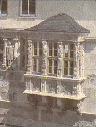 Das Bild zeigt den Erker der wertvollen Renaissance-Fassade des »Kaiserhauses« in Hildesheim.
